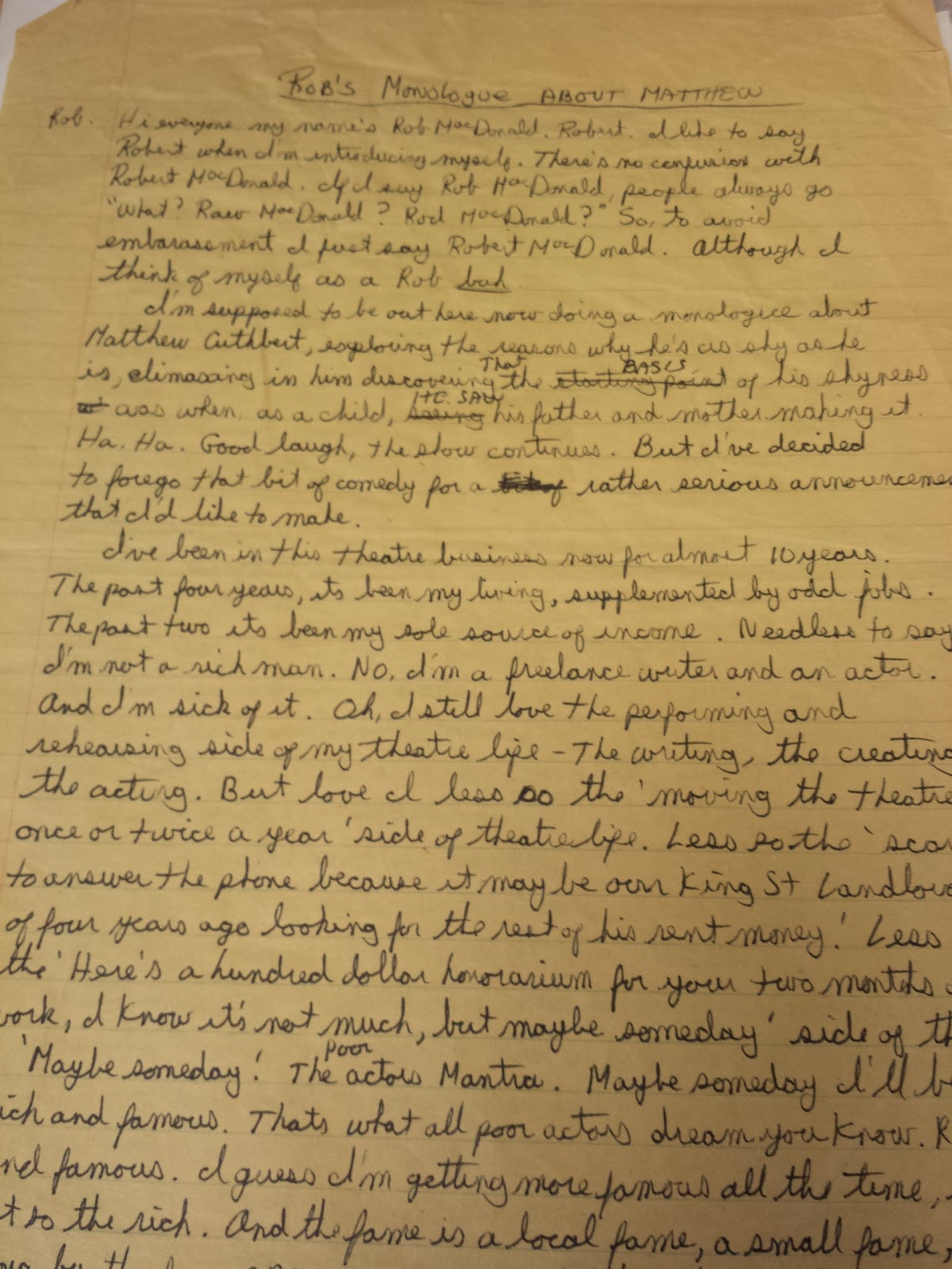 I’m supposed to be out here now doing a monologue as Matthew Cuthbert, exploring the reasons why he’s as shy as he is, climaxing in him discovering that the basis of his shyness was when, as a child, he saw his father and mother making out. Ha Ha, good laugh, the show continues.