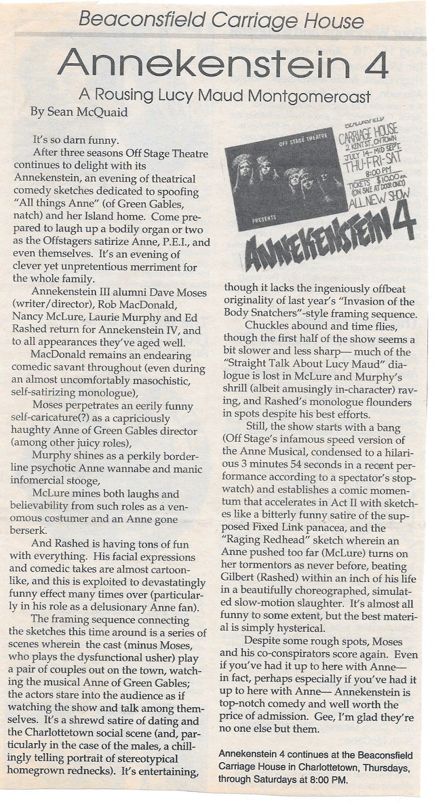 This is the first page of a monologue (well, most of it’s a monologue) I wrote and performed during Annekenstein IV (1994). That was the summer we were at the Carriage House at Beaconsfield. The previous year we were at the old Condon’s Woolen Mill location on Fitzroy, and the two years before that, it was Off Stage Theatre, where City Cinema now is.