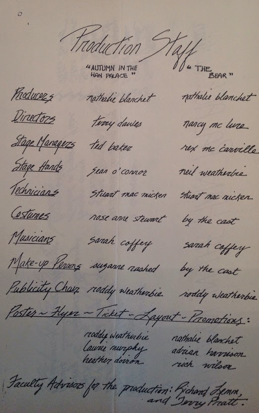 One-Act play, produced by the UPEI Theatre Society. Directed by Nancy McLure. Also with Linda Wigmore as Elena Ivanova Popova, and Peter Ewart as Luka.