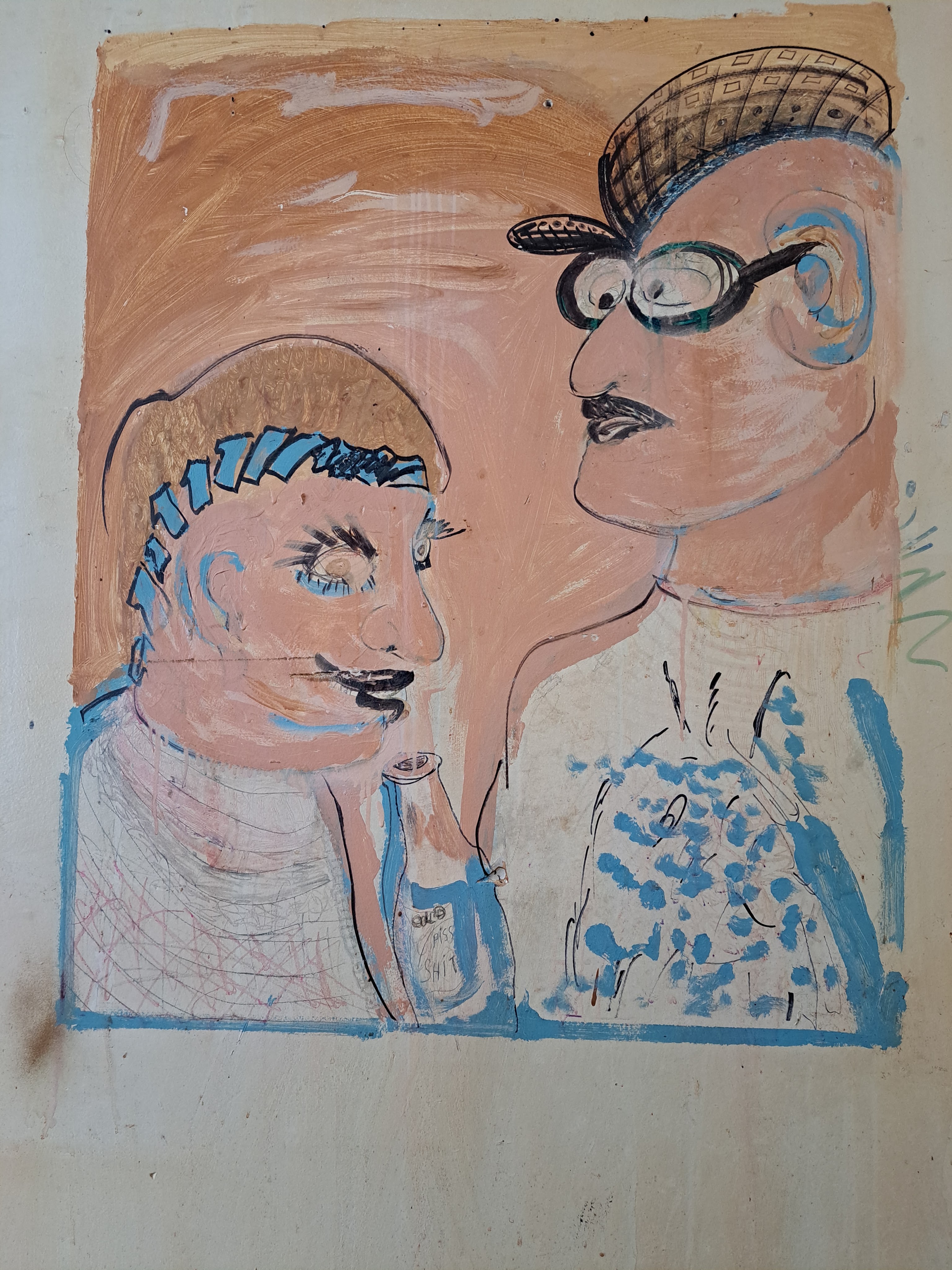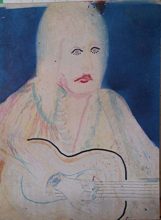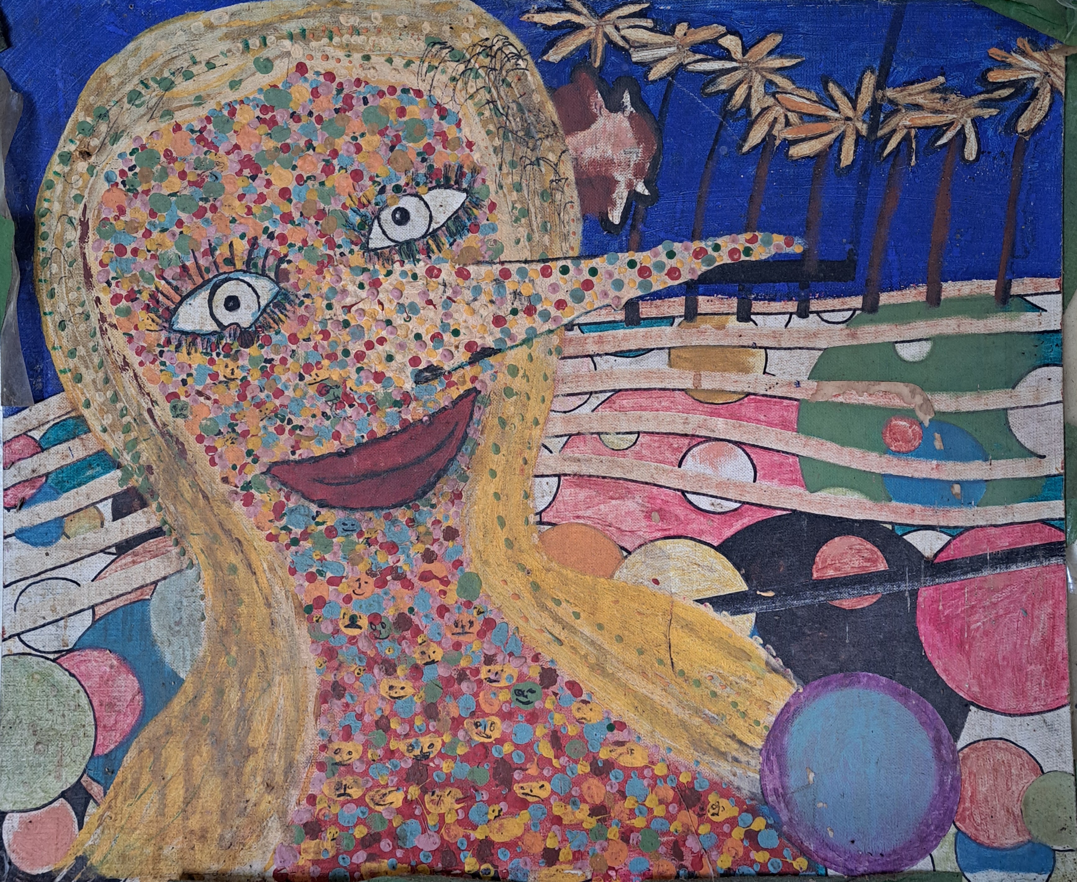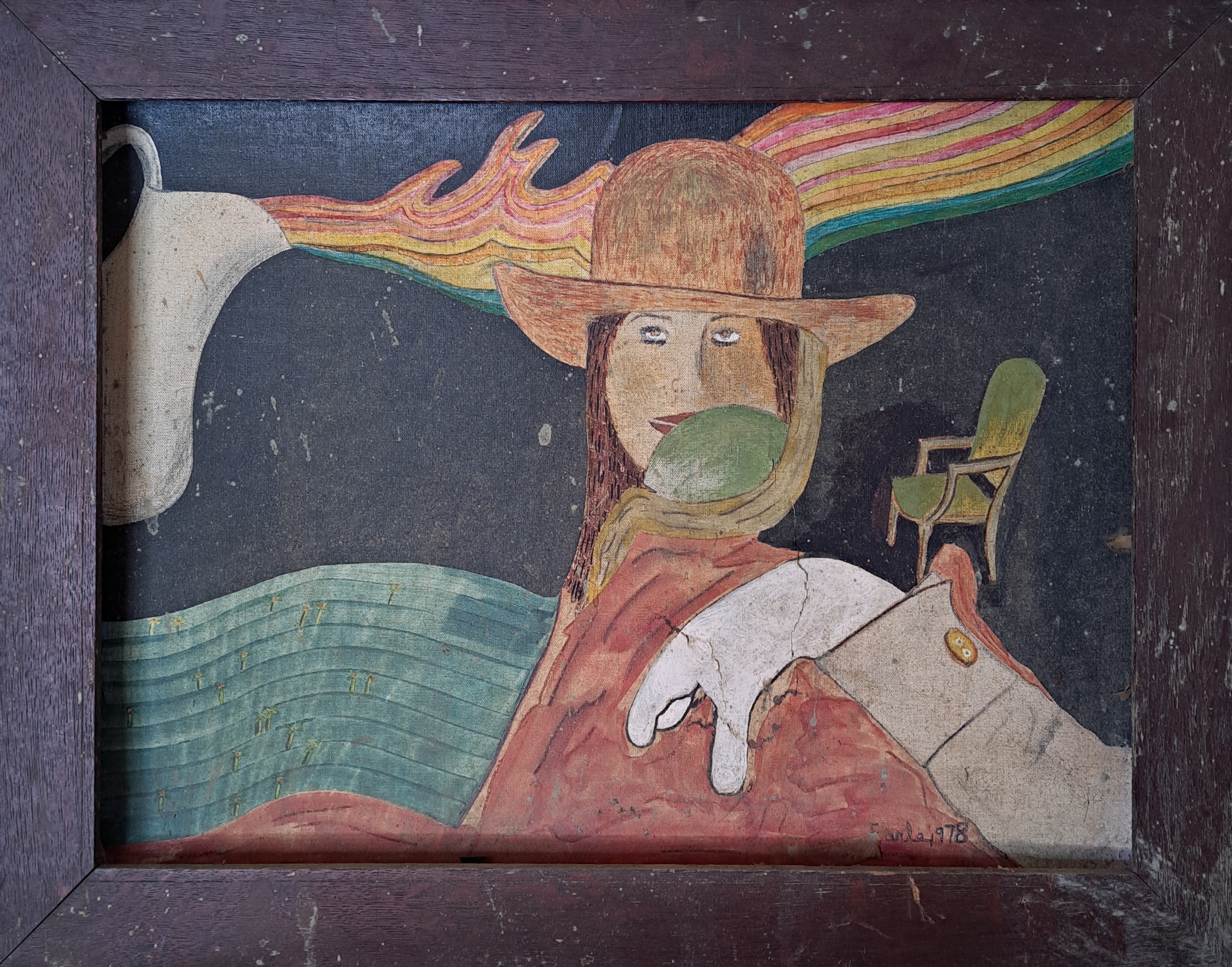 I’ve been cleaning out Earle’s house over the past couple of months, and have been putting aside most of his paintings. Some were in too bad a condition to keep and had to be tossed. Most of what remain are in some form of disrepair – dirty, dusty, torn, grimy, or worse. They all could use a good, gentle cleaning. They come in all sizes, from a few inches by a few more inches, to a few feet by a few more feet. Some are painted on canvas, some on other types of material, some on cardboard, and some are painted right on the walls of his house.